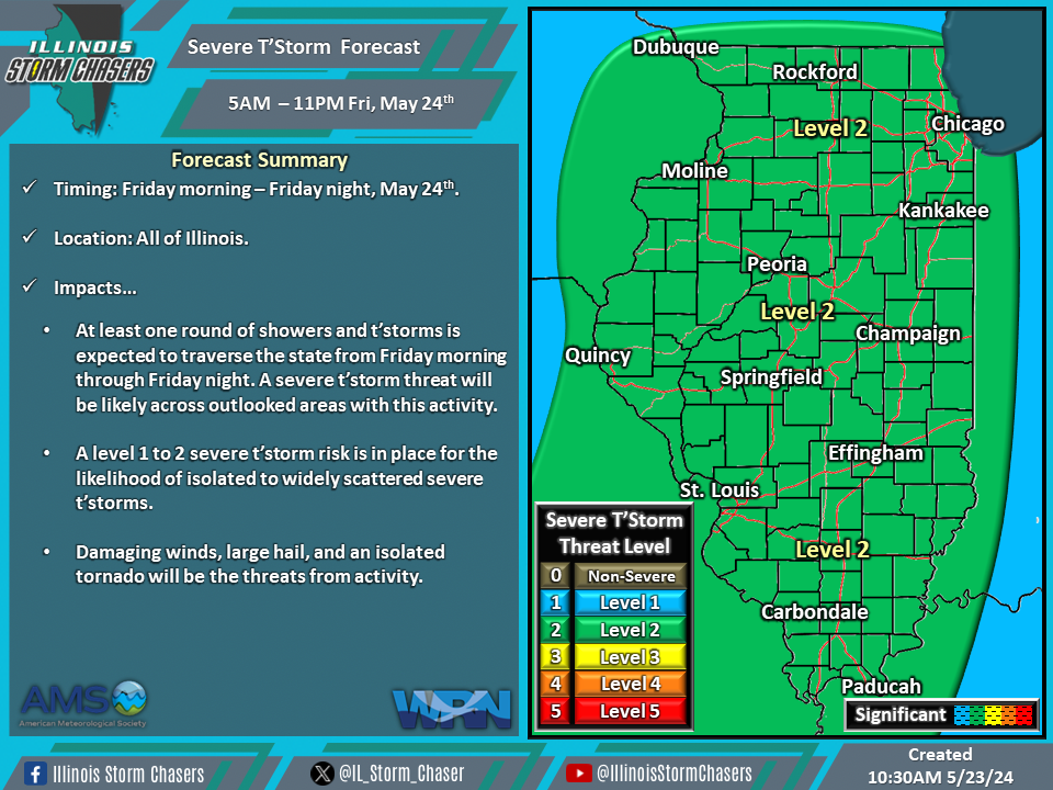 •A level 1 to 2 severe t’storm risk is in place across all of Illinois from Friday morning through Friday night for the likelihood of isolated to widely scattered severe t’storms. Damaging winds, large hail, and an isolated tornado will be the threats from activity. At least one round of showers and t’storms is expected to traverse the state from Friday morning through Friday night. A severe t’storm threat will be likely across outlooked areas with this activity.