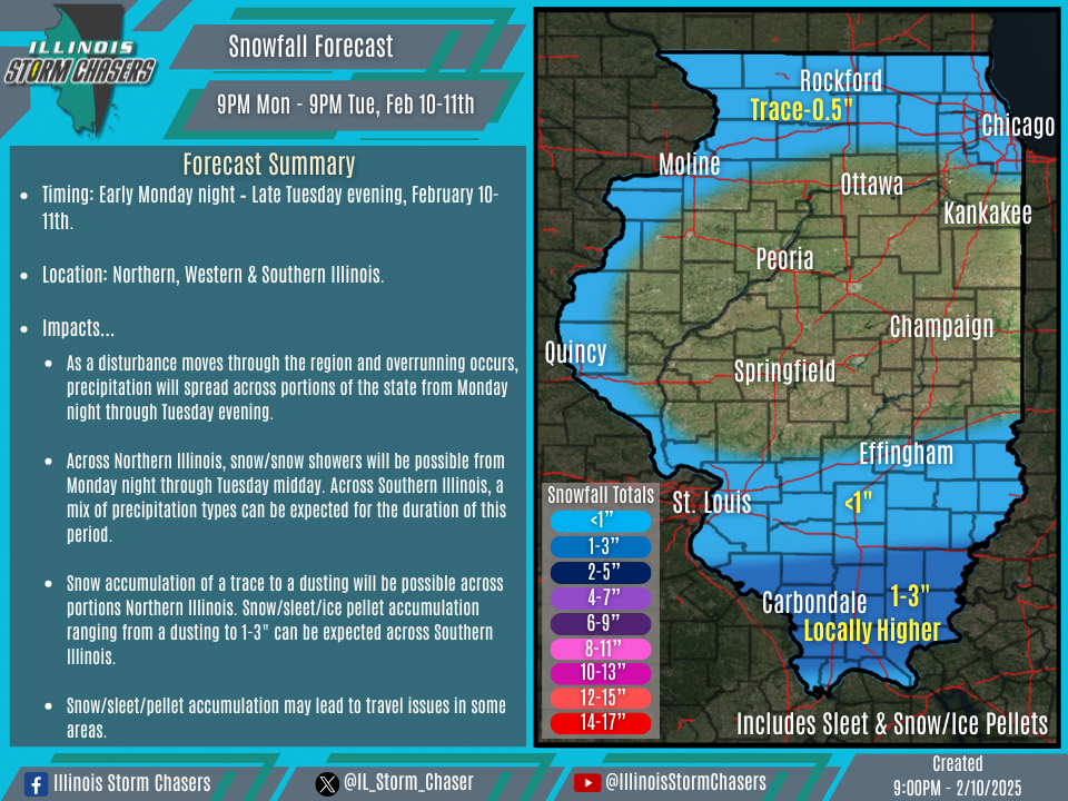 •Snow accumulation of a trace to a dusting will be possible across portions Northern Illinois. Snow/sleet/ice pellet accumulation ranging from a dusting to 1-3″ can be expected across Southern Illinois.
