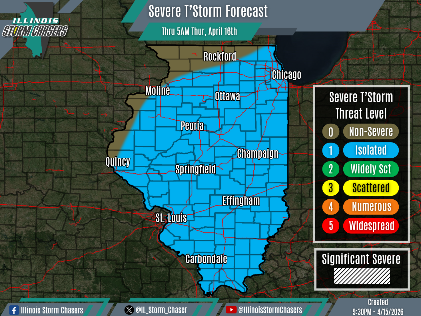 •A level 1 severe t’storm threat is in place across much of Illinois from tonight through early Thursday morning, for the threat of isolated severe t’storms. All modes of severe weather will be possible, including large hail, damaging winds and an isolated tornado.