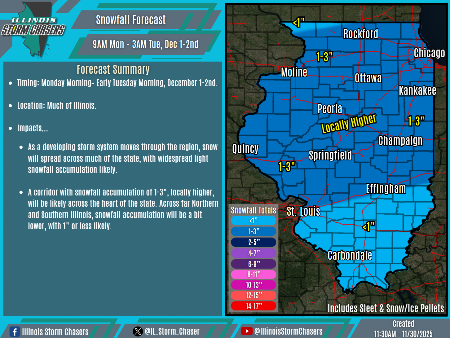 •A corridor with snowfall accumulation of 1-3″, locally higher, will be likely across the heart of the state. Across far Northern and Southern Illinois, snowfall accumulation will be a bit lower, with 1″ or less likely.
