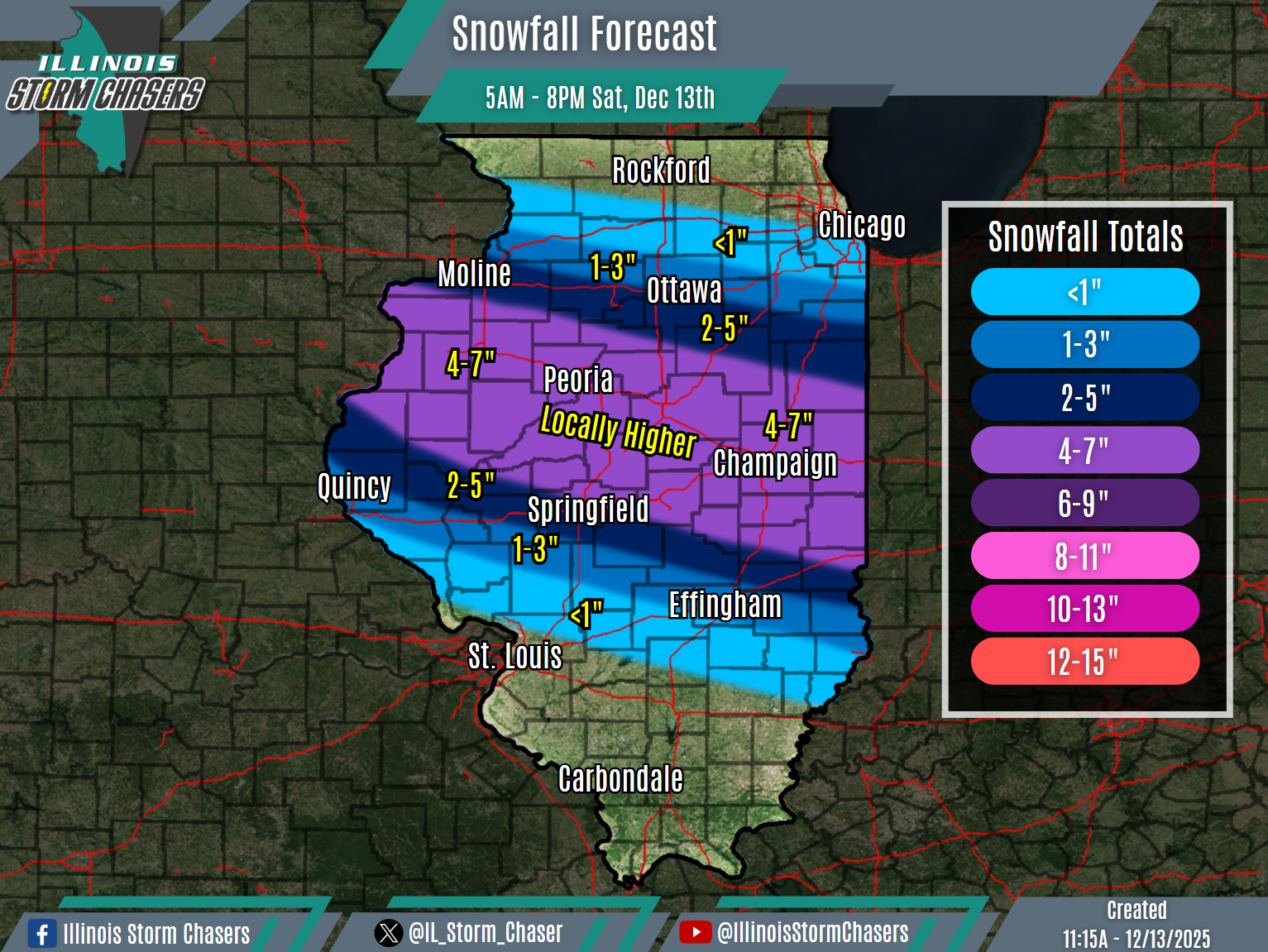 •A corridor with snowfall accumulation of upwards of 2-5″ to 4-7″ will be likely across the heart of Illinois, with amounts tapering on either side of this axis. Locally higher snowfall amounts will be possible within the highest snowfall corridor, in Central Illinois.
