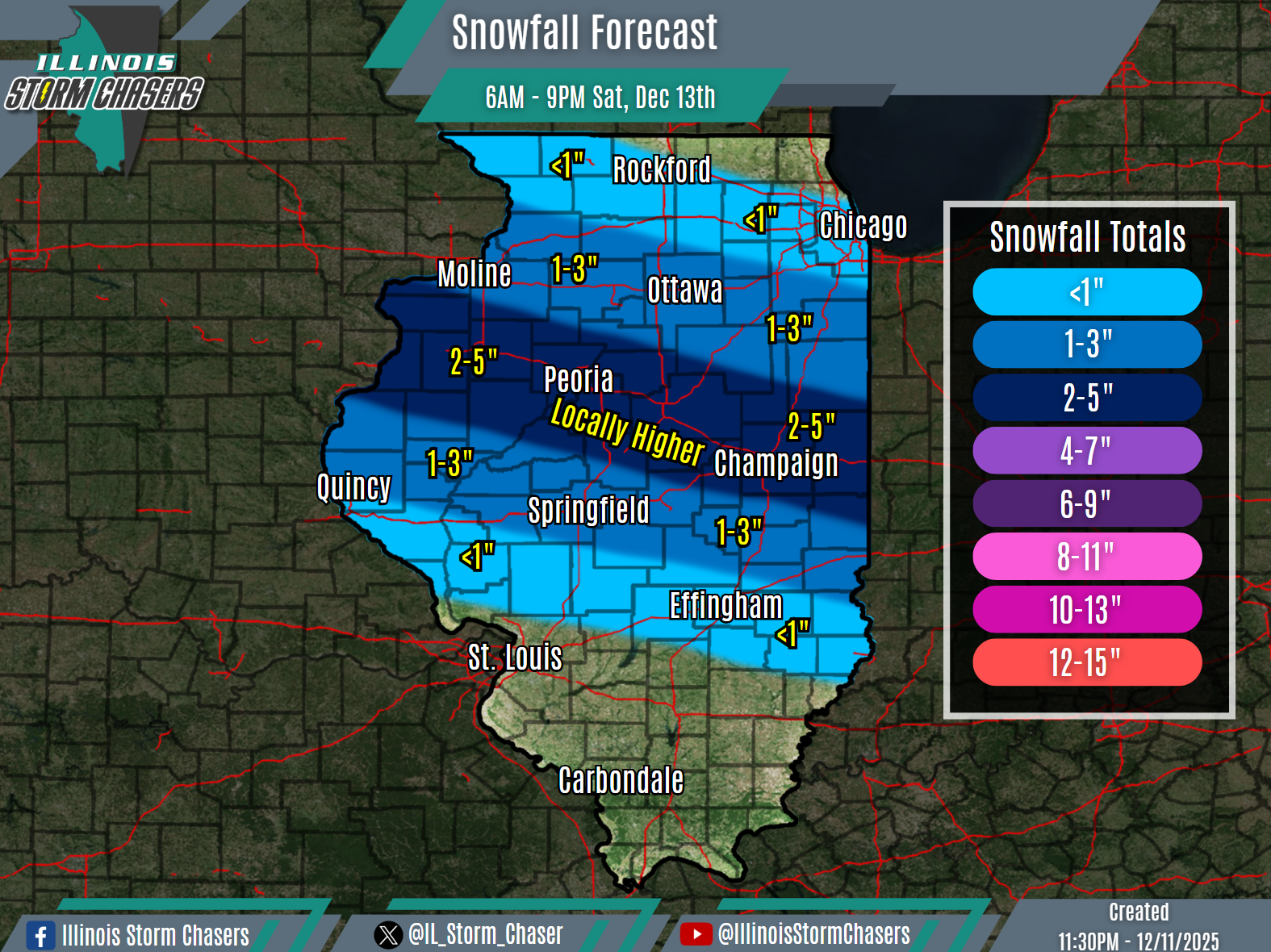 •A corridor with snowfall accumulation of upwards of 1-3″ to 2-5″ will be likely across the heart of Illinois, with amounts tapering on either side of this axis. Locally higher snowfall amounts cannot be ruled out within the highest snowfall corridor, in Central Illinois.