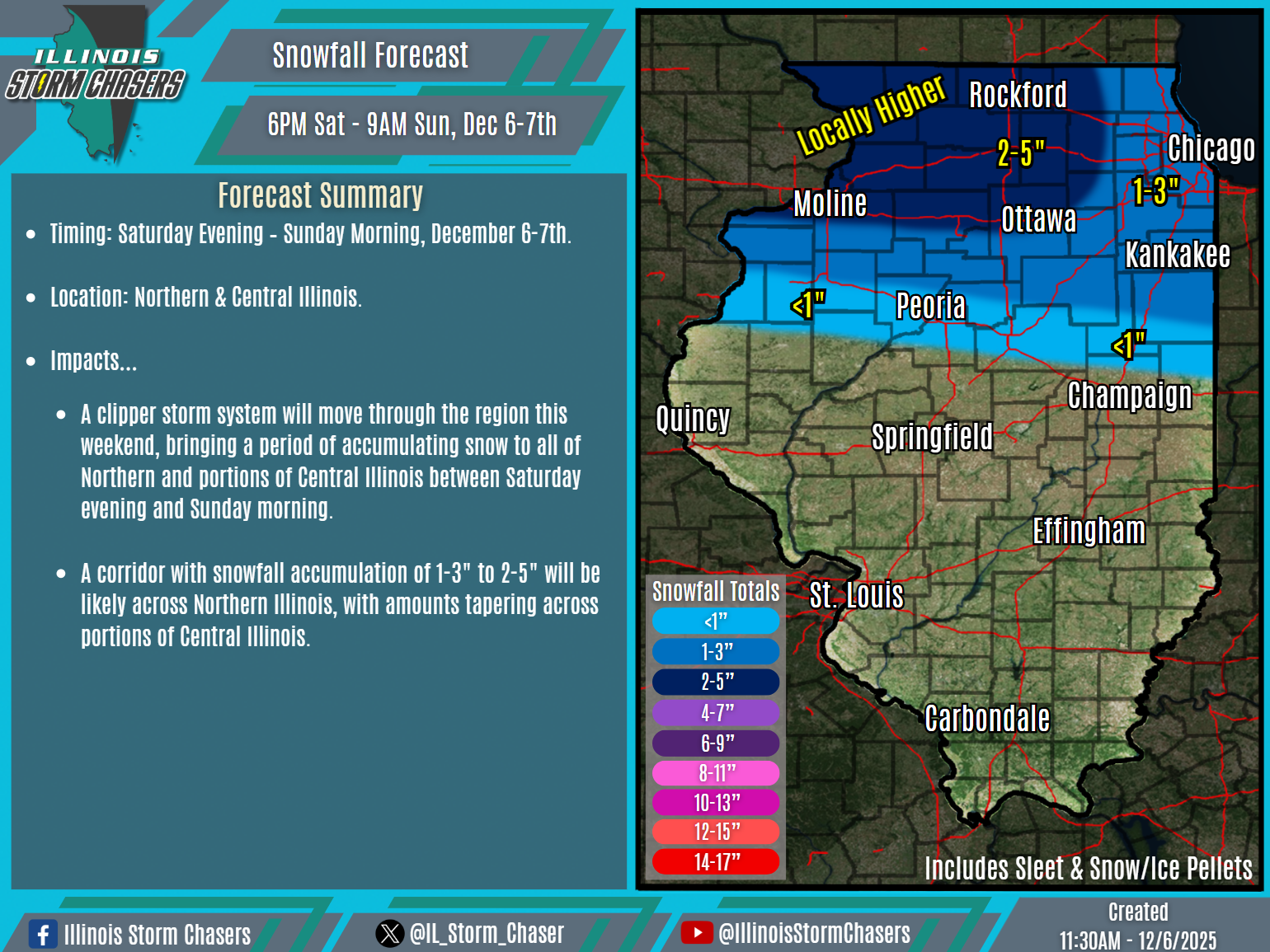 •A clipper storm system will move through the region this weekend, bringing a period of accumulating snow to all of Northern and portions of Central Illinois between Saturday evening and Sunday morning. Additionally, mixed wintry precipitation will also be likely across portions of Central Illinois