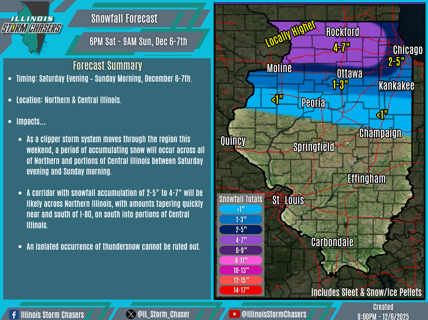 (9:00PM – Saturday, December 6th, 2025) Several inches of accumulating snow and some mixed precip expected tonight into early Sunday…
