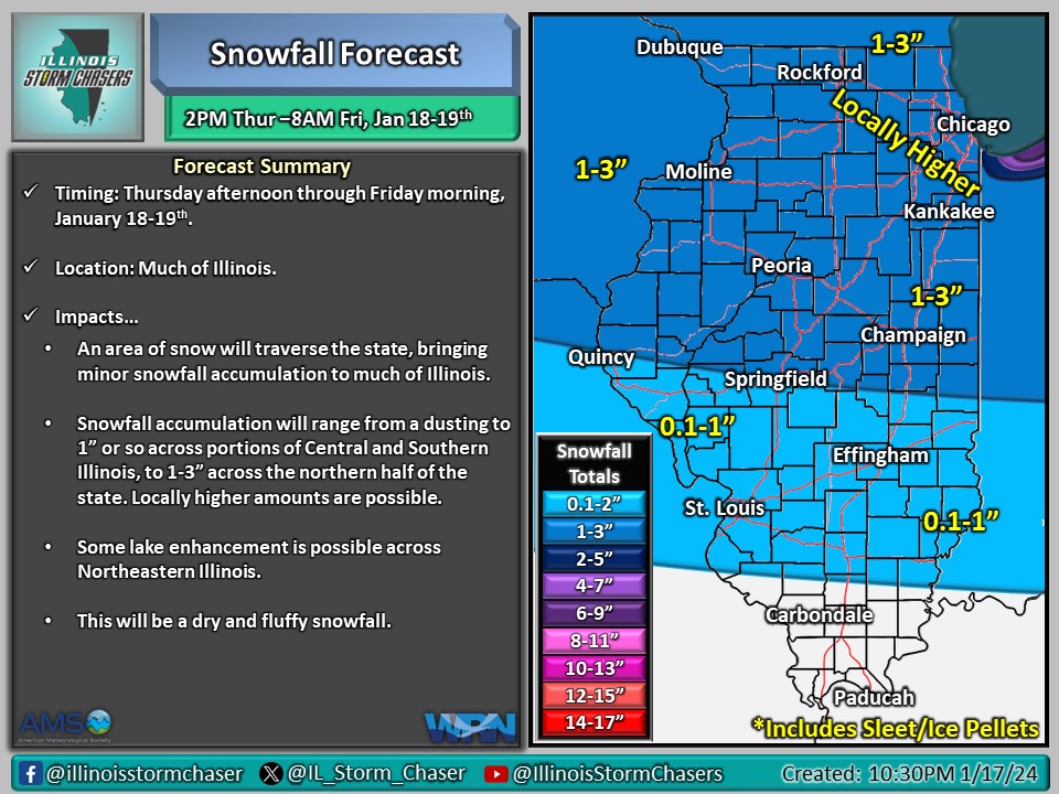 •Snowfall accumulation will range from a dusting to 1” or so across portions of Central and Southern Illinois, to 1-3” across the northern half of the state. Locally higher amounts are possible.