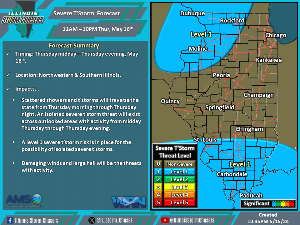 •A level 1 severe t’storm risk is in place across Northwestern and Southwestern Illinois from Thursday midday through Thursday evening for the possibility of isolated severe t’storms. Hail and damaging winds will be the threats with activity. Scattered showers and t’storms will traverse the state from Thursday morning through Thursday night. An isolated severe t’storm threat will exist across outlooked areas with activity from midday Thursday through Thursday evening.