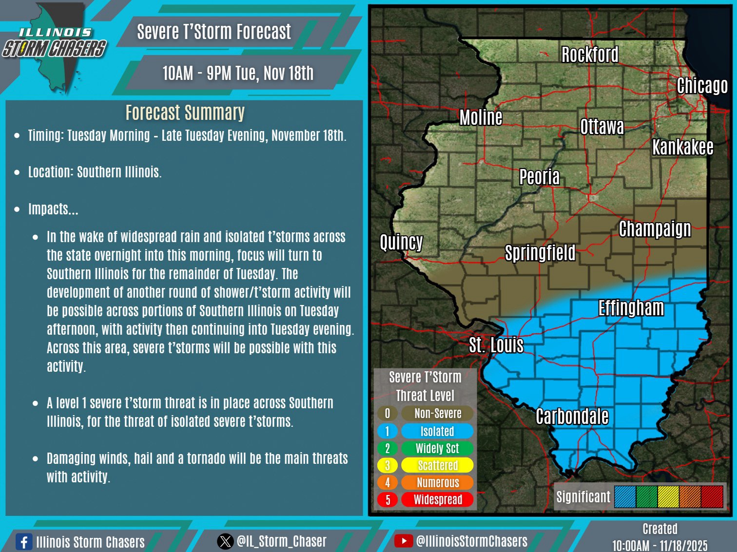 •In the wake of widespread rain and isolated t’storms across the state overnight into this morning, focus will turn to Southern Illinois for the remainder of Tuesday. The development of another round of shower/t’storm activity will be possible across portions of Southern Illinois on Tuesday afternoon, with activity then continuing into Tuesday evening. Across this area, severe t’storms will be possible with this activity.