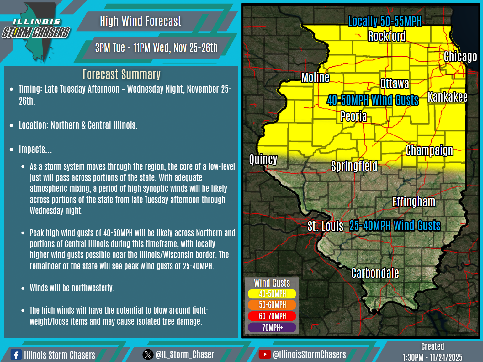 •Peak high wind gusts of 40-50MPH will be likely across Northern and portions of Central Illinois during this timeframe, with locally higher wind gusts possible near the Illinois/Wisconsin border. The remainder of the state will see peak wind gusts of 25-40MPH. Winds will be northwesterly. The high winds will have the potential to blow around light-weight/loose items and may cause isolated tree damage.