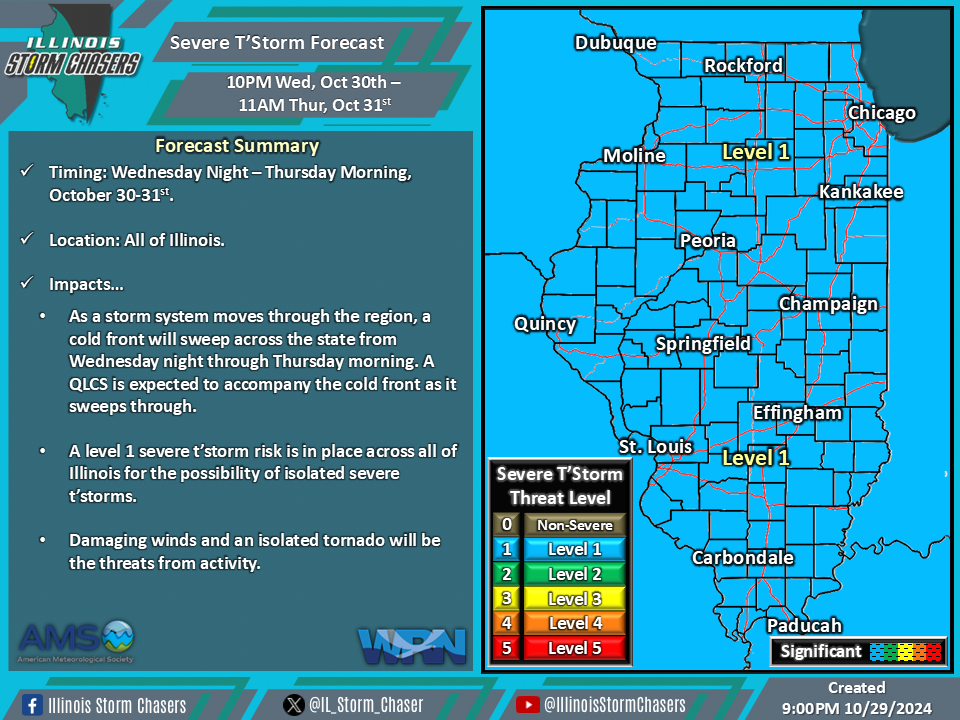 •A level 1 severe t’storm risk is in place across all of Illinois from Wednesday night through Thursday morning for the possibility of isolated severe t’storms. Damaging winds and an isolated tornado will be the threats from activity.