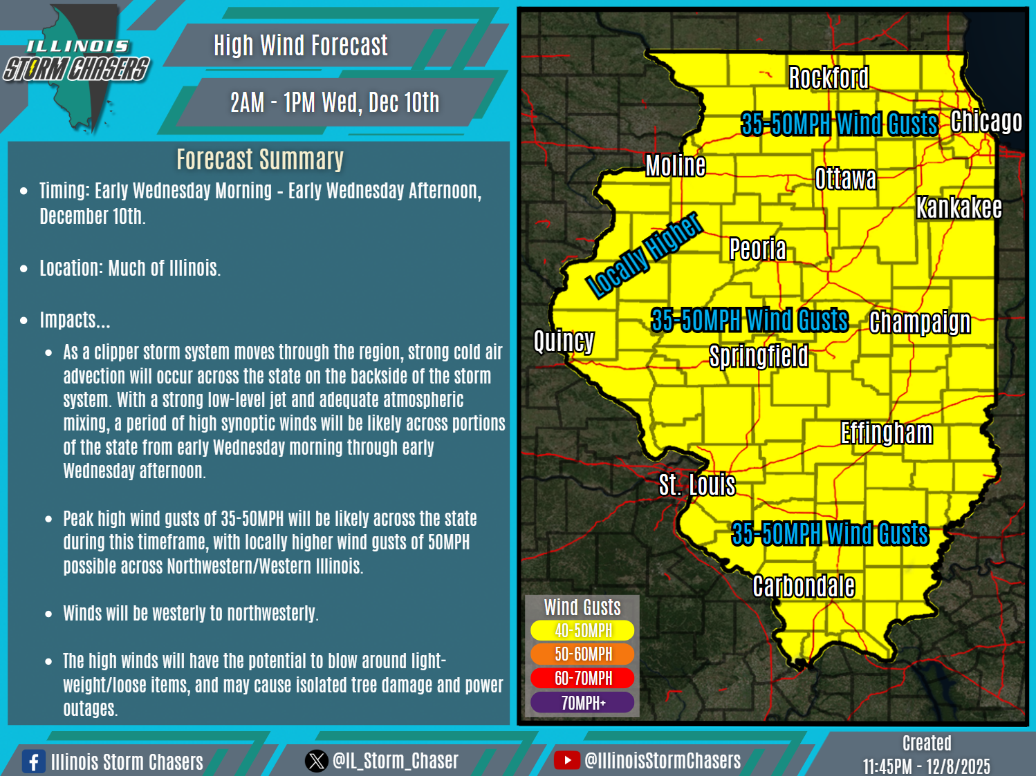 •Peak high wind gusts of 35-50MPH will be likely across the state during this timeframe, with locally higher wind gusts of 50MPH possible across Northwestern/Western Illinois.